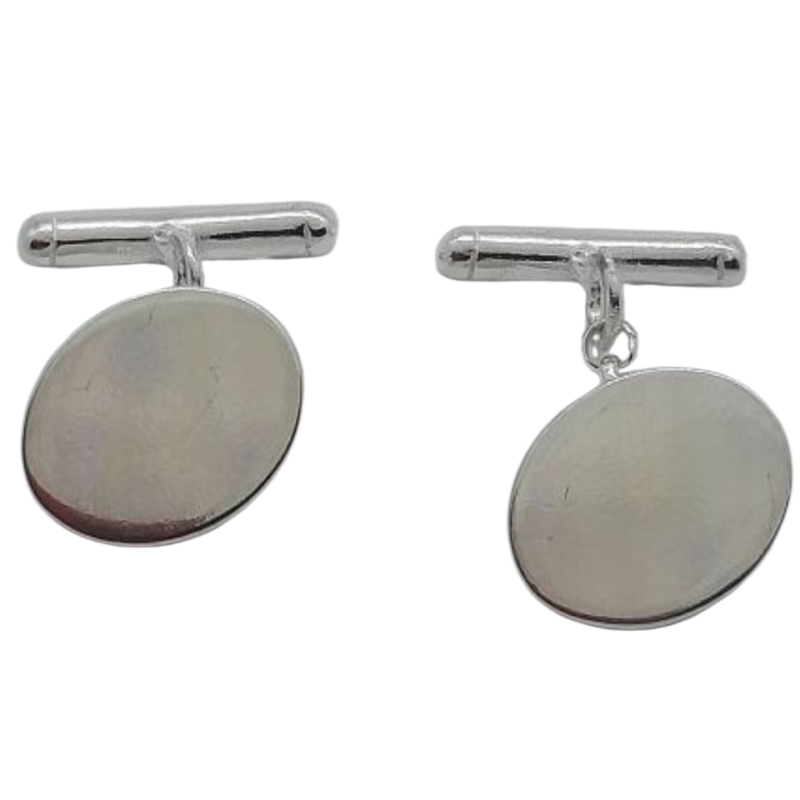 Gemelos de plata de ley lisa de forma oval con cadena.