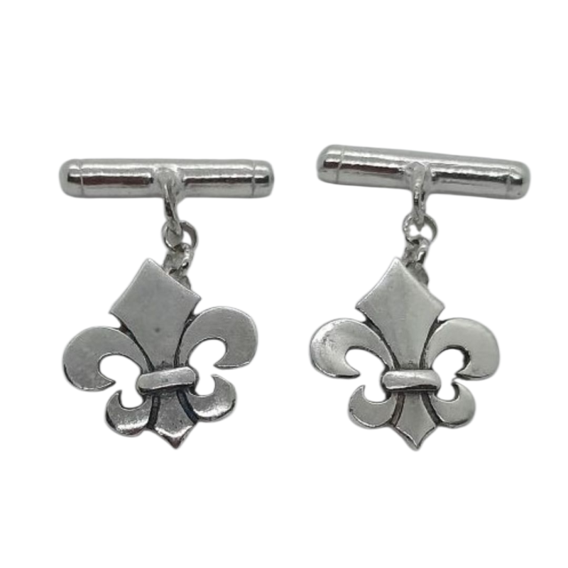Gemelos Flor de Lis en silueta con cadena, de plata de ley de 925 mls.Medidas aproximadas de 1.6x1.5 cm.