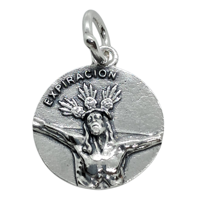 Medalla con imagen Cristo Expiracion en relieve de forma redonda de plata de ley de 925 mls con unas medidas aproximadas de 19 mm.La parte trasera lisa.