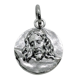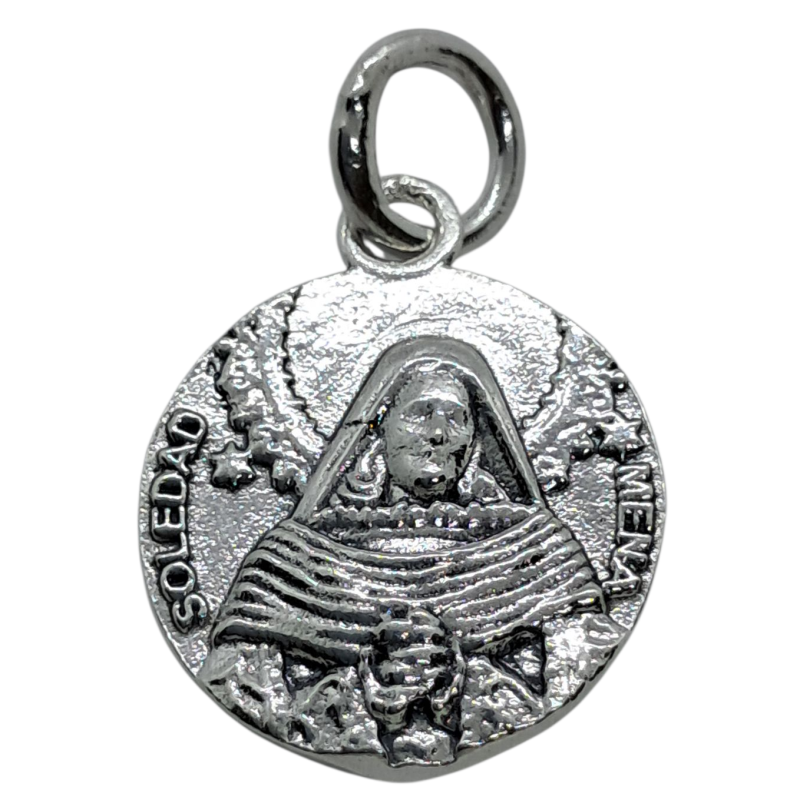 Medalla Escapulario redonda Virgen de la Soledad en relieve de plata de ley de 925 mls con unas medidas aproximadas de 18 mm. La parte trasera Imagen Cristo de Mena.