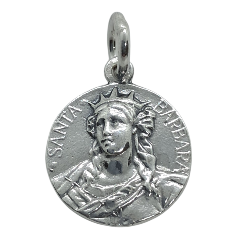 Medalla con imagen de Virgen de Santa Bárbara redonda en relieve de plata de ley de 925 mls con unas medidas aproximadas de 19 mm. La parte trasera lisa.