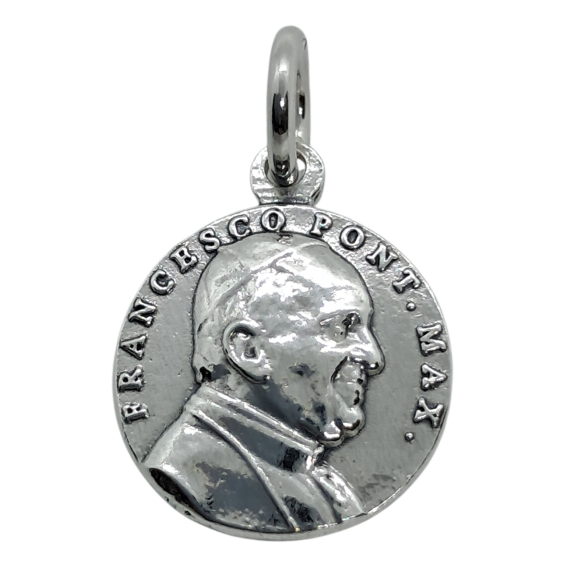 Medalla con imagen del Papa Francisco en relieve de forma redonda de plata de ley de 925 mls con unas medidas aproximadas de 19 mm.La parte trasera lisa.