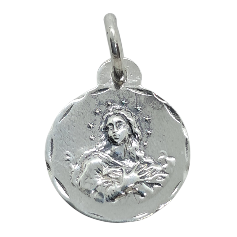Medalla con imagen de la Purísima en relieve de forma redonda de plata de ley de 925 mls con unas medidas aproximadas de 17 mm.La parte trasera es lisa.